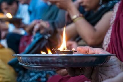 Durante el crepúsculo, en los ghats de Har-Ki-Pairi que bordean el Ganges. Todos los días, al caer la noche, hindúes y turistas asisten al arathi, una ceremonia de lo más fascinante.